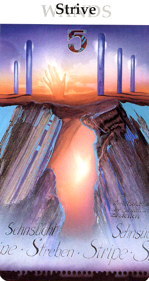 The 5 of Wands represents competition. The 5 is the second assignment number, and therefore a difficult card. 5 combined with the Wand's element fire challenges you. You'll have to fight hard for your idea, but you stand a good chance of succeeding.