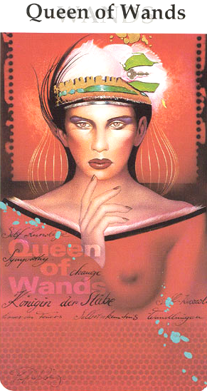 The Queen of Wands is drawn when you (have to) become more aware of the properties of the Wands suit; vitality, optimism and enthousiasm.