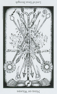 The 9 represents rest after work, which is another thing (like 8) that the element Fire associated with Wands is not very comfortable with. Fire likes to keep going. This rest will probably be spent thinking about what to do next along the course to completion.