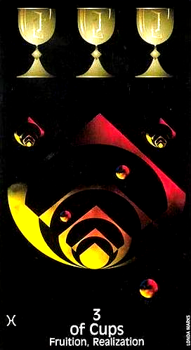 The 3 of Cups represents hope, faith and love. The 3 is a reward number and in this suit of Cups your feelings during that number will be that of joy and self-contentment.