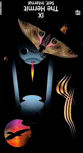 The Hermit shuts out the world and retreats into solitude to better understand some spiritual aspect of life. He opens to the cosmos and lets it's wisdom sink in. Hermits are often seen as wise old men who can guide a traveller along a journey.