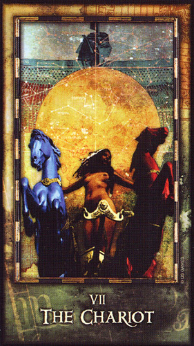 During the prevous card, The Lovers, all the wisdom of the first cards in the deck has been processed and a choice was made for personal growth. Now it's time to do something with all this baggage, to actually travel the road. A lot has been done so far, wisdoms have been accumulated and integrated into one's personality.
