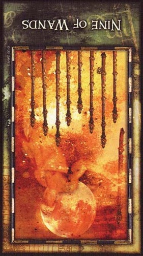 The 9 represents rest after work, which is another thing (like 8) that the element Fire associated with Wands is not very comfortable with. Fire likes to keep going. This rest will probably be spent thinking about what to do next along the course to completion.