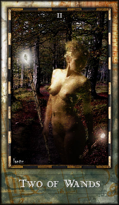 The 2 of Wands represents the research and digestion of a new idea. The number of this card and it's element are somewhat in conflict; while the 2 is focussed inwards, the Wand's element fire is outgoing. Fire wants to steam ahead while the blackbox 2 asks for patience.