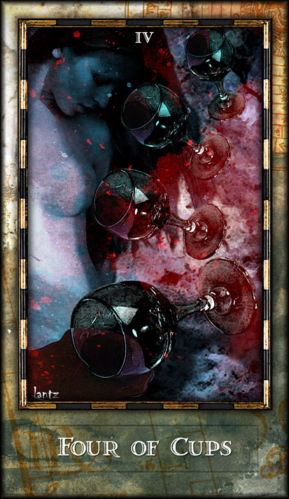 With the 4, the second cycle of this suit is commenced, where a choice between structure and feeling has to be made, where old securities have to be let go of to work towards a new future. But like Wands, Cups don't like structure much, they prefer to be free and dream rather than to make commitments and go for something.