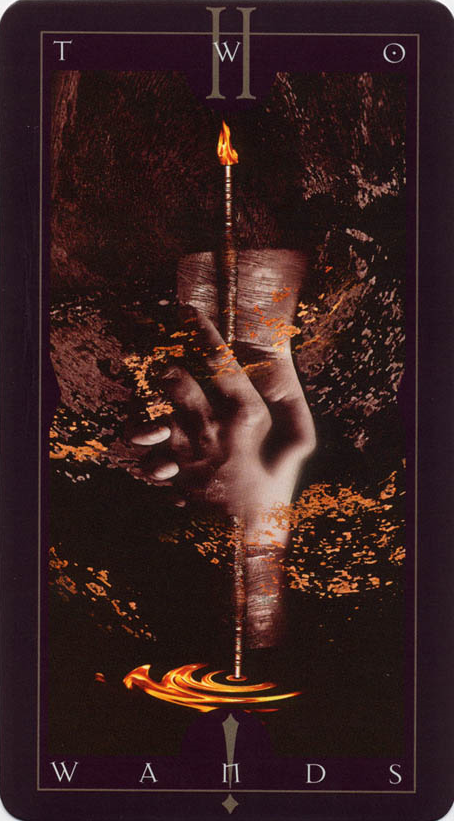 The 2 of Wands represents the research and digestion of a new idea. The number of this card and it's element are somewhat in conflict; while the 2 is focussed inwards, the Wand's element fire is outgoing. Fire wants to steam ahead while the blackbox 2 asks for patience.