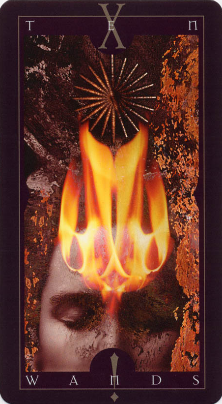 The 10 of Wands is therefore the transition from the element Fire (associated with Wands) to the element Water, associated with Cups. As you might imagine, this not the easiest of transitions.