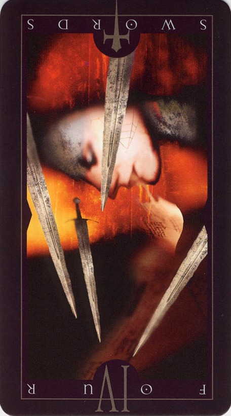 4 is the first number in the cycle of giving things shape. It's about making things real. The element of Swords also relates to making things real, so this enhances the effect so much that arrogance can cause you to exhaust yourself.