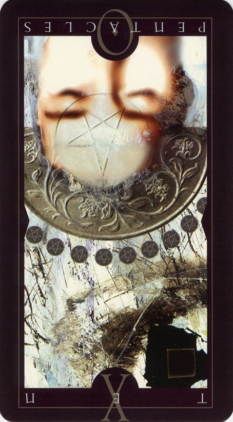 The 10 of Pentacles represents material posessions. The number 10 of Pentacles forms the links to the Ace (first card) of Wands (the first suit in the minor Arcana), and thus prepares to bring you back to the beginning of the minor Arcana, ready for a next cycle through the tarot.