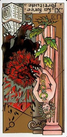 This card carries the number 11. In the Rider-Waite deck, Strength and Justice have swapped places because Waite saw links with the astrological signs Leo and Libra.