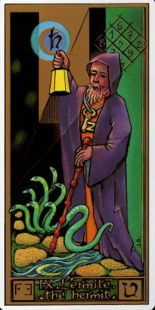The Hermit carries the number 9. This is the highest base number. After 9 the composed numbers emerge. Therefore the number 9 is the gateway to a higher order. It is also a place to rest before embarking on the next leg of the journey.