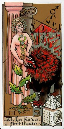 This card carries the number 11. In the Rider-Waite deck, Strength and Justice have swapped places because Waite saw links with the astrological signs Leo and Libra.