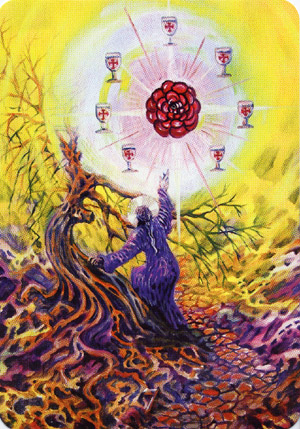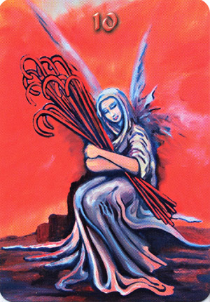 The 10 of Wands is therefore the transition from the element Fire (associated with Wands) to the element Water, associated with Cups. As you might imagine, this not the easiest of transitions.
