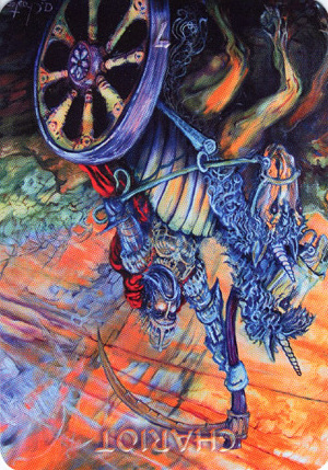 During the prevous card, The Lovers, all the wisdom of the first cards in the deck has been processed and a choice was made for personal growth. Now it's time to do something with all this baggage, to actually travel the road. A lot has been done so far, wisdoms have been accumulated and integrated into one's personality.