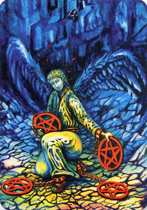 The 4 of Pentacles is about holding on to what you got. The number 4 represents structure and order, and fits well with the suit's element, Earth.