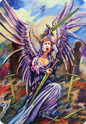 The 5 of Swords is about facing reality. The 5 is an assignment number, and in the slighly more difficult suit of Swords, it means you face a difficult challenge where your past experiences could hold you down.