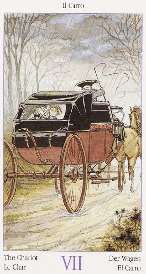 During the prevous card, The Lovers, all the wisdom of the first cards in the deck has been processed and a choice was made for personal growth. Now it's time to do something with all this baggage, to actually travel the road. A lot has been done so far, wisdoms have been accumulated and integrated into one's personality.
