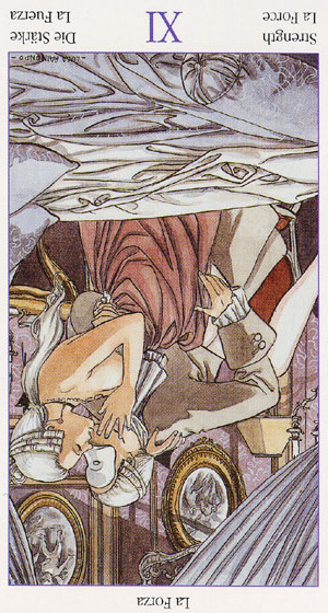 This card carries the number 11. In the Rider-Waite deck, Strength and Justice have swapped places because Waite saw links with the astrological signs Leo and Libra.