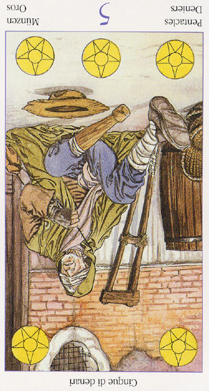 The 5 of Pentacles is an assignment-number card, and is about letting go of your securities. Pentacles element Earth (also) represents material posessions, so this card is about letting go of (some of) your worldly assets.