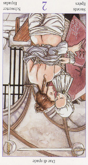 This the first assignment number of the Cups suit. Unlike Wands, with the Fire element, Cups, with the water element, has a lot more patience. Water is by nature more introspective, and this second card in the Cups suit is indeed about exploring yourself. The outcome is uncertain as always, but it usually results in better acceptance of yourself.