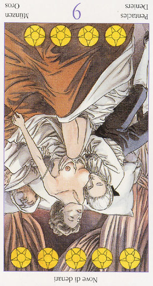 The 9 of Pentacles represents earned rest. The element Earth, attached to the Pentacles suit, appreciates the rest that completion of hard work brings. This is a good time for games and relaxation.