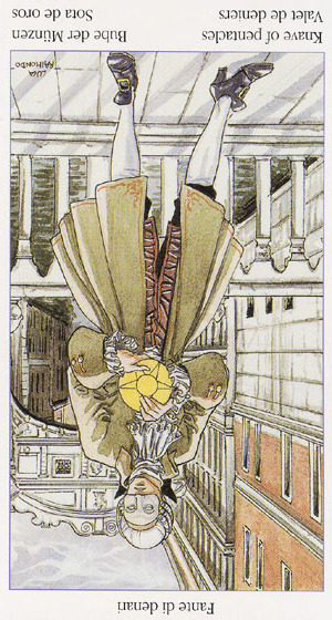 Pages explore and gather information about the road ahead, with an almost naive attitude. The Page of Pentacles is sometimes described as a bridge builder; Pentacles is the suit where the actual work is done, and the Page here enables those that follow to quickly cross difficult terrain.
