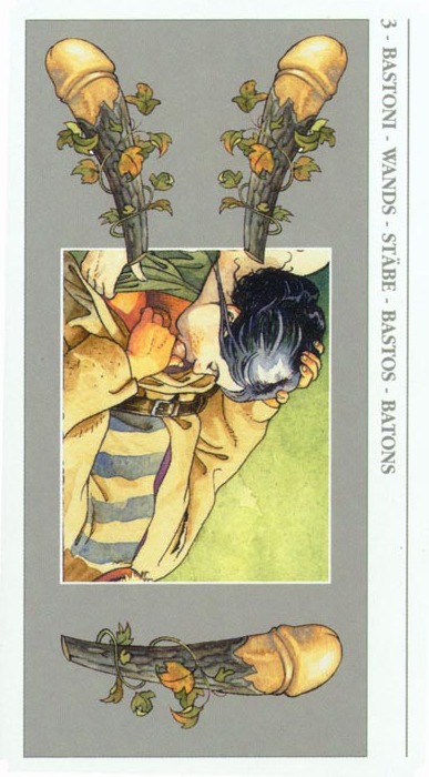 This card is about exposing your new ideas to the world. The Wand's element fire goes well with the number 3, as 3 is an output number, a number of results. Fire likes getting to results quickly.