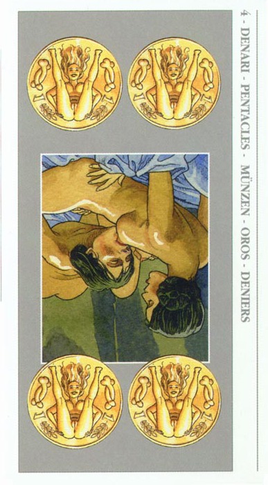 The 4 of Pentacles is about holding on to what you got. The number 4 represents structure and order, and fits well with the suit's element, Earth.