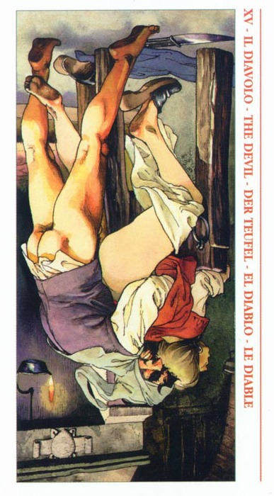 The number this card carries is 15, composed that is 6. The resemblances to the first '6' card (The Lovers) are remarkable; in both cards security is a central theme.