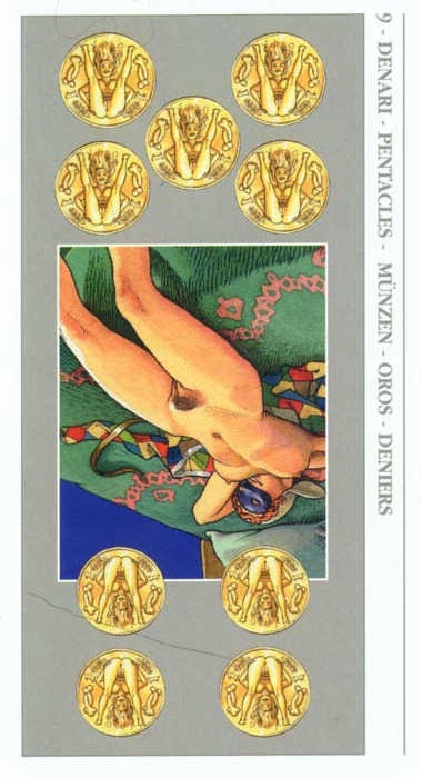 The 9 of Pentacles represents earned rest. The element Earth, attached to the Pentacles suit, appreciates the rest that completion of hard work brings. This is a good time for games and relaxation.