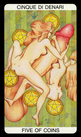 The 5 of Pentacles is an assignment-number card, and is about letting go of your securities. Pentacles element Earth (also) represents material posessions, so this card is about letting go of (some of) your worldly assets.