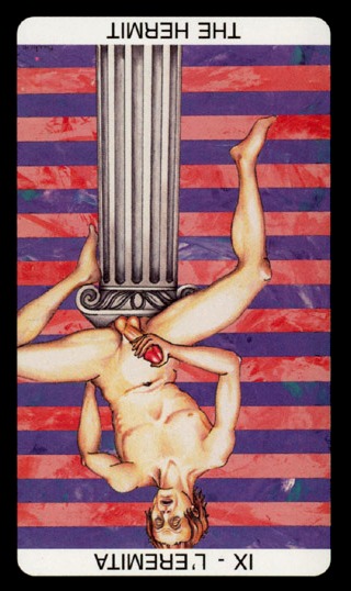 The Hermit shuts out the world and retreats into solitude to better understand some spiritual aspect of life. He opens to the cosmos and lets it's wisdom sink in. Hermits are often seen as wise old men who can guide a traveller along a journey.