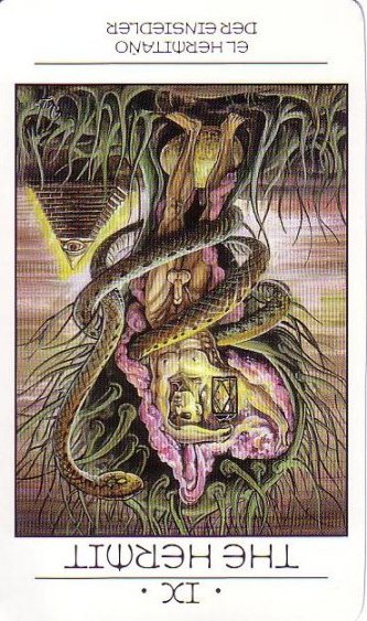 The Hermit carries the number 9. This is the highest base number. After 9 the composed numbers emerge. Therefore the number 9 is the gateway to a higher order. It is also a place to rest before embarking on the next leg of the journey.