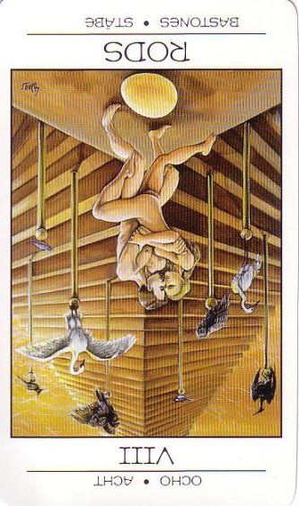 The 8 of Swords is about slowly regaining strength and energy. The 8 is an assignment number, and in the element of Swords it's a bit harder than usual.