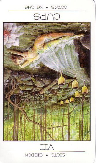 The 7 of Cups is about making a choice between different ideals. But Cups, with the water element, don't like making definitive choices that much, making this 7 in this suit a bit of a hard choice.