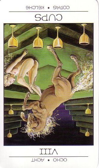 8 is an assignment number, and in the suit of Cups, it is about overcoming the urge to sink into depression caused by view on the long road ahead.