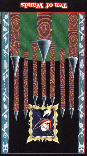 The 10 of Wands is therefore the transition from the element Fire (associated with Wands) to the element Water, associated with Cups. As you might imagine, this not the easiest of transitions.