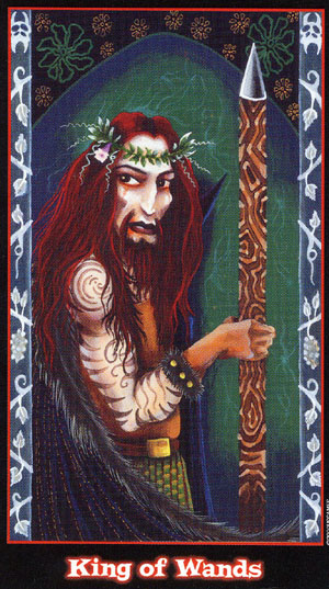 The King of Wands uses the properties of Wands (vitality, optimism, enthousiasm) to go out with confidence. He is seen as a leader with charisma.