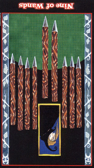 The 9 represents rest after work, which is another thing (like 8) that the element Fire associated with Wands is not very comfortable with. Fire likes to keep going. This rest will probably be spent thinking about what to do next along the course to completion.