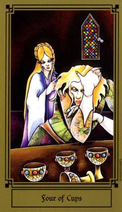 With the 4, the second cycle of this suit is commenced, where a choice between structure and feeling has to be made, where old securities have to be let go of to work towards a new future. But like Wands, Cups don't like structure much, they prefer to be free and dream rather than to make commitments and go for something.