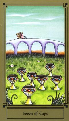 The 7 of Cups is about making a choice between different ideals. But Cups, with the water element, don't like making definitive choices that much, making this 7 in this suit a bit of a hard choice.