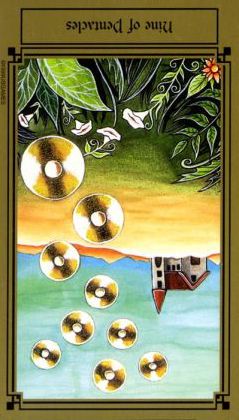 The 9 of Pentacles represents earned rest. The element Earth, attached to the Pentacles suit, appreciates the rest that completion of hard work brings. This is a good time for games and relaxation.