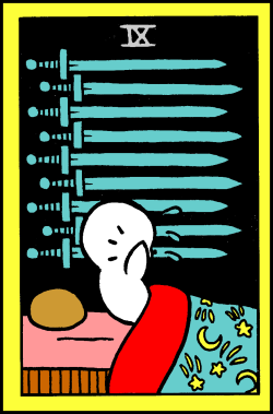 The 9 of Swords represents relief from cropped-up grief. The number 9 is a number of reward and rest and accomplishment. In the element of Swords there is not a lot of time for rest, but without any rest you'd just burn yourself out.