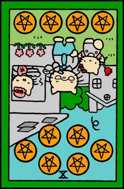 The 10 of Pentacles represents material posessions. The number 10 of Pentacles forms the links to the Ace (first card) of Wands (the first suit in the minor Arcana), and thus prepares to bring you back to the beginning of the minor Arcana, ready for a next cycle through the tarot.