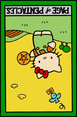 Pages explore and gather information about the road ahead, with an almost naive attitude. The Page of Pentacles is sometimes described as a bridge builder; Pentacles is the suit where the actual work is done, and the Page here enables those that follow to quickly cross difficult terrain.