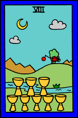 8 is an assignment number, and in the suit of Cups, it is about overcoming the urge to sink into depression caused by view on the long road ahead.