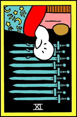 The 8 of Swords is about slowly regaining strength and energy. The 8 is an assignment number, and in the element of Swords it's a bit harder than usual.