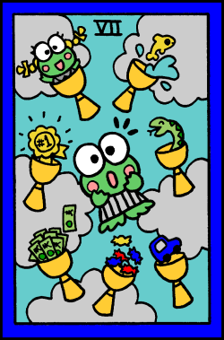 The 7 of Cups is about making a choice between different ideals. But Cups, with the water element, don't like making definitive choices that much, making this 7 in this suit a bit of a hard choice.