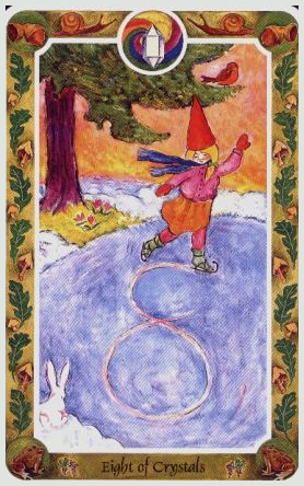 The 8 of Pentacles is about keeping up the hard work you're doing, and trying to be happy about doing that work at the same time. While the 3 of Pentacles is about completing a masterpiece, the 8 of Pentacles is about doing the apprentice work that makes you a master of your trade.