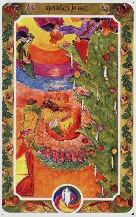The 10 of Pentacles represents material posessions. The number 10 of Pentacles forms the links to the Ace (first card) of Wands (the first suit in the minor Arcana), and thus prepares to bring you back to the beginning of the minor Arcana, ready for a next cycle through the tarot.